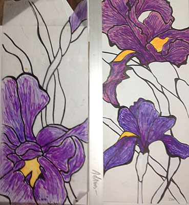 The Twins "Livid" and "Lucid" "Livid" was the original commission delivered in 1983. More than thirty years later, a complimentary panel was created for my client's beautiful northern Michigan log home. Both panels used Lambert's antique purples and clear crackle glass. The stems are accented in layers of Chicago Art Glass ripple. |